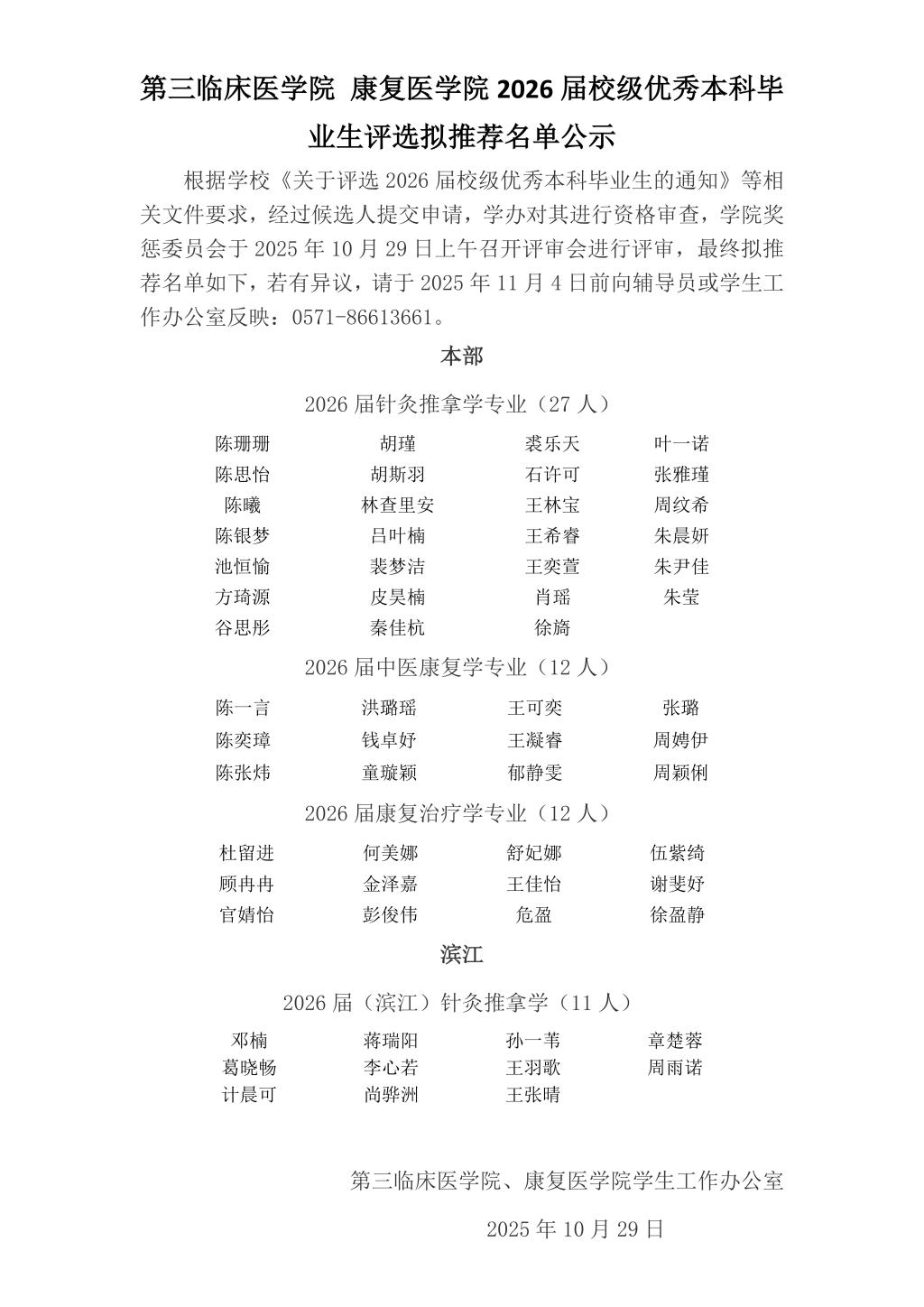 第三临床医学院、康复医学院2026届校级优秀本科毕业生评选拟推荐名单公示